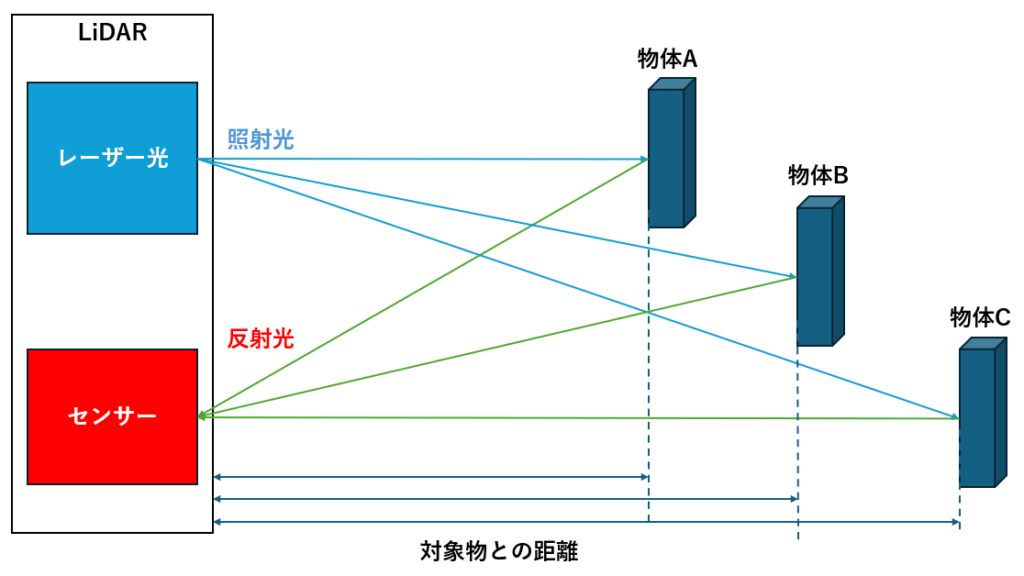 LiDARはレーザー光を使って距離を測定するセンサーです。レーザーを発射し、対象物に当たって戻るまでの時間から距離を算出します。