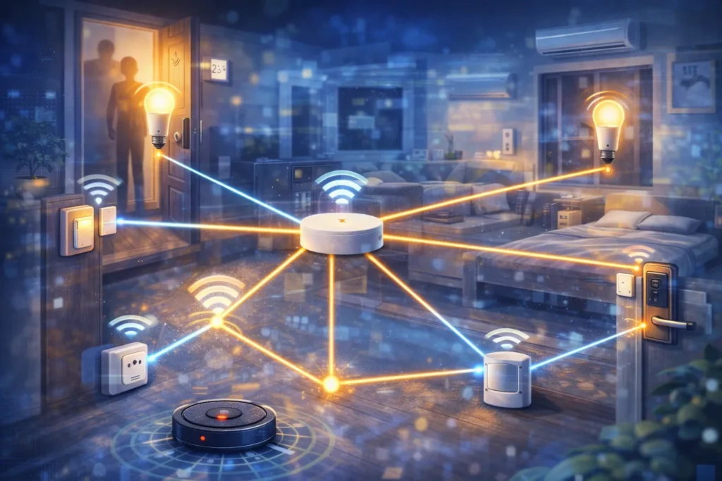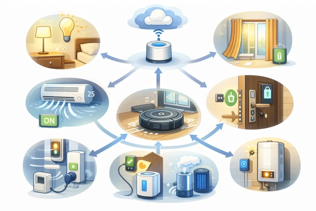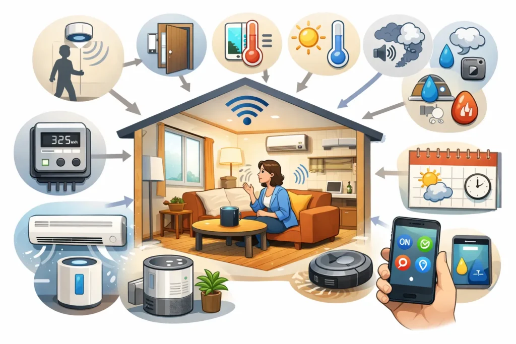 こうした入力は、「人がいる」「ドアが開いた」「部屋が暑い」「外出した」「そろそろ寝る時間」といった現実世界の出来事をデータに変換します。スマートホームが“賢く”見えるのは、この入力が継続的に集まり、次の動作を決める材料になっているからです。