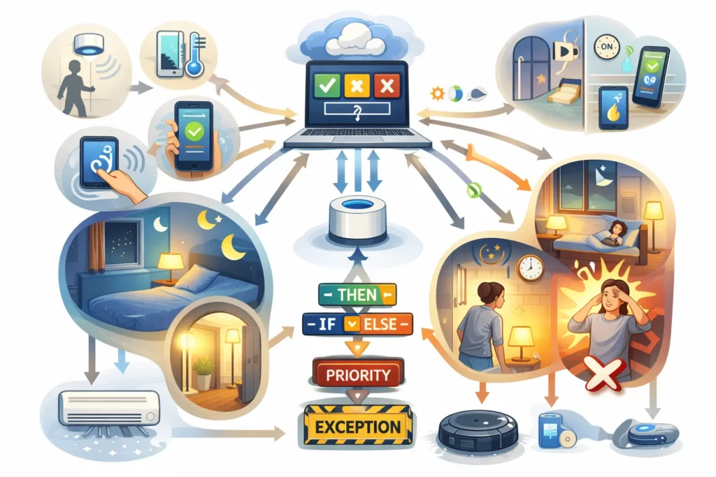 制御とは単なる自動化ルールではなく、「条件の組み合わせ」「優先順位」「例外処理」まで含めた判断の仕組みです。スマートホームでは、ハブやクラウド、アプリがこの判断の中枢となり、複数の入力を同時に扱います。