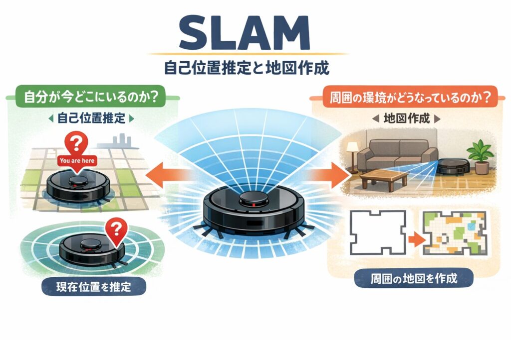 SLAMは、ロボット掃除機が自己位置を見失わずに動き続けるための中核技術です。移動量の誤差を環境情報で補正しながら、地図作成と自己位置推定を同時に行うことで、賢く効率的な掃除を実現しています。