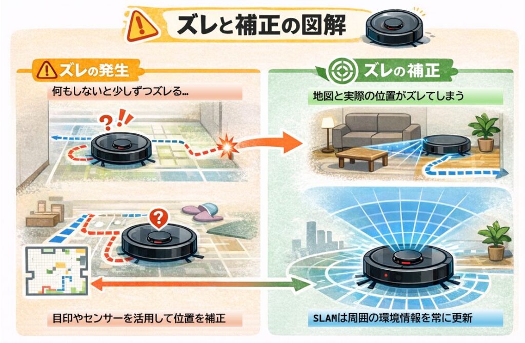 このズレを放置すると、地図と実際の位置が合わなくなり、壁にぶつかったり、同じ場所を何度も掃除したりしてしまいます。